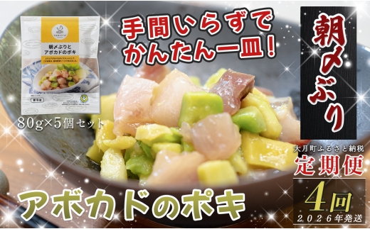 - 【定期便4回】朝〆ぶりとアボカドのポキ (80g×5個)|ブリ 鰤 海鮮丼 小分け 時短 簡単調理 人気 新鮮 魚介 高知県 大月町 国産 送料無料 お取り寄せ おつまみ ごま油 香味ソース 個包装 ポキ丼 漬け 簡単おかず 解凍だけ 養殖ぶり