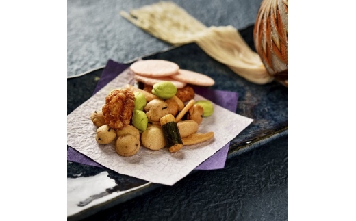 いか味、醤油味、わさび味の豆菓子と海老せん、揚げ餅、アーモンドをミックス!