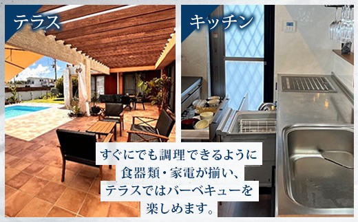 キッチンには調理家電が揃い、テラスでバーベキューを愉しめます。