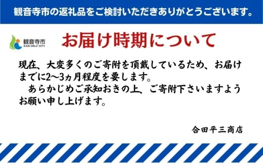 観音寺市は、香川県の西端に位置しており、穏やかな瀬戸内海の燧灘(ひうちなだ)に面しています。 名勝「琴弾公園」の有明浜は、「日本の渚百選」及び「日本の夕日百選」に認定されており、本市のシンボルとも言える銭形砂絵「寛永通宝」が描かれています。1633年に藩主の生駒高俊公を迎えるために一夜にして作られたと伝えられているこの巨大な砂絵は、東西122m、南北90m、周囲345mもあり、これを見れば健康で長生きし、お金に不自由しないといわれています。 沖合には伊吹島などの島しょを有し、網元が水揚げから製造までを一貫して行うことで鮮度にこだわって生産された「伊吹いりこ」は、讃岐うどんのダシには欠かせないものとなっています。 近年では、テレビアニメ『結城友奈は勇者である』の作品舞台のモデルとして、2018年、2019年と2年続いて「訪れてみたい日本のアニメ聖地88」に選ばれました(一般社団法人 アニメツーリズム協会実施)。 また、SNSをきっかけに、市内と美しい瀬戸内海が一望できる高屋神社本宮の鳥居が『天空の鳥居』として注目されるなど、「瀬戸内国際芸術祭」や「日本学生トライアスロン選手権」の開催地としても、日本全国の方々に訪れていただいております。 ぜひ一度、観音寺市にいらっしゃいませんか。心癒される時間を過ごしていただけると思います。 ※返礼品の受領は一時所得として課税対象になります。詳しくは、国税庁HPをご覧ください。