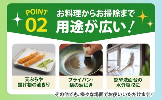 2枚重ねで、水や油をたっぷり、すばやく吸収するため、いろいろな用途にお使いいただけます。