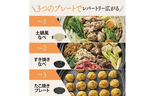 ◎3枚タイプ「土鍋風なべ」「区切り線つきたこ焼きプレート」「遠赤すき焼きなべ」