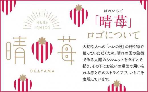 晴苺~HAREICHIGO~  美しい色と形、濃厚な甘さと香り。  くだもの王国おかやまが誇るブランド苺です。 「くだもの王国おかやま」が自信を持ってお届けする最高級いちごが「晴苺(はれいちご)」です。口いっぱいに広がる濃厚な味わいと、甘さを一層引き立てるちょうど良い酸味、 果皮は濃い赤色で、中の果肉まで赤色なのが特徴です。 ”晴れの日に、晴苺” 手間暇をかけて大切に育てた高品質ないちごは、大切な人の「ハレの日」の贈り物にふさわしい逸品です。 *まだまだ出荷数が少ないため、希少性が高く、県内・県外を問わず、中々手に入らない逸品となっています。 *「晴苺」は岡山県の登録商標です。 以前、まぼろしチョイスに掲載され、瞬く間に寄附受付終了となった返礼品です★  ※お届け日・時間の指定及び発送前の電話、メール等での事前連絡は行っておりません。 ※ご不在の期間がある場合は、お知らせください。