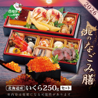 銀鱈西京焼き/連子鯛真砂和え/海老錦手まり/紅鮭松前焼き/海老塩麹漬け/穴子塩麹焼き/金目鯛炙り焼き/くるみ甘露/小海老蜜煮/あわび福良煮/高野豆腐含め煮/蟹甲羅焼き/本ズワイ蟹爪/烏賊黄金焼き/ばい貝うま煮/からすみ/いくら醤油漬け/明太子昆布〆/松前漬け/眞子煮/雲丹貝盛り/たたき牛蒡