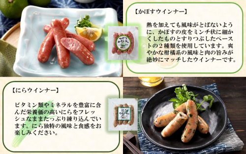 熱を加えても風味がとばないように、かぼすの皮をミンチ状に細かくしたものとすりつぶしたペーストの2種類を使用しています。爽やかな柑橘系の風味と肉の旨みが絶妙にマッチしたウインナーです。