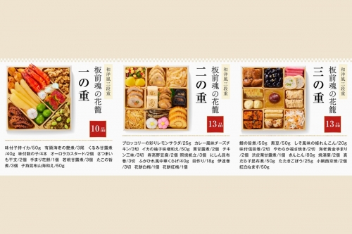 ふかひれ風中華くらげ40g、イカの松前漬(生姜入り)25g、若桃甘露煮2個、彩り柚子くらげ50g、チキン三昧3枚、田作り10g、たこの旨煮3個、イカの燻製サラダ55g、栗甘露煮2個、伊達巻3枚、花餅白梅1個、花餅紅梅1個、豚バラ黒糖角煮スライス3枚