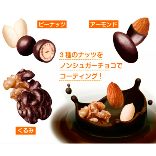 ピーナッツ・アーモンド・くるみの3種のナッツをノンシュガーチョコレートで自然な甘さに仕上げました。