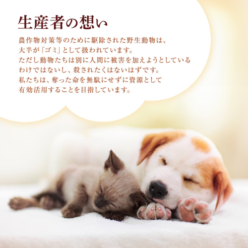 小諸市産鹿肉を用いたペット用飼料の研究が麻布大学獣医学部で行わており、商品は全て防腐剤や酸化防止剤、防カビ剤・着色料を一切使用しない安心安全な商品です。