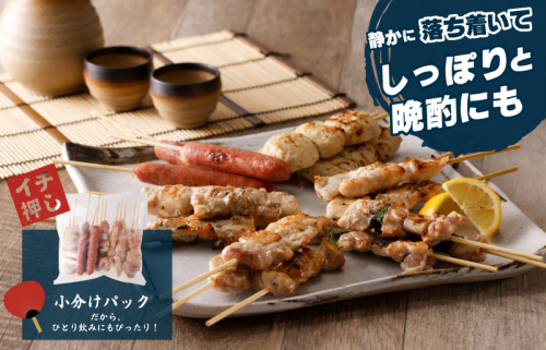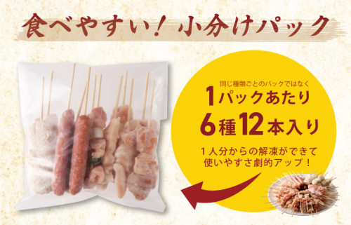 もも12本(約25g/本)、モモねぎま12本(約25g/本)、ムネ12本(約25g/本)、つくね12本(約40g/本)、ソーセージ12本(約25g/本)、肩12本(約25g/本)