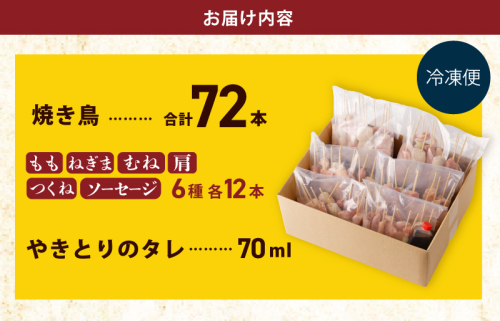 - 焼鳥 6種72本【国産 国産鶏 鶏肉 焼き鳥 やきとり 加工品 惣菜 おかず おつまみ 冷凍 小分け もも ねぎま ムネ つくね ソーセージ 肩 タレ付き 農福連携】 G1734