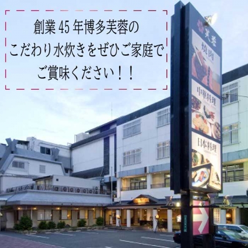 創業45年博多一筋に営業してきた、 博多芙蓉こだわりの水炊き鍋です。 <鶏へのこだわり> 2つの食感を味わっていただくよう、モモ、ムネ肉の2種類をご用意しています。 また、鶏のすべてを味わって頂けるよう、特製ミンチもお付けしています。 <スープへのこだわり> 鶏のエキスをギュッと濃縮して鶏ガラスープを使用。 食べられる際は、まず、濃縮スープをご試飲し、鶏の旨味を味わい下さい。 <〆のご飯> 水炊きの〆は雑炊をご賞味ください。 鶏から出た濃厚なスープを最後まで味わうことが出来ます。 ※写真はイメージです。