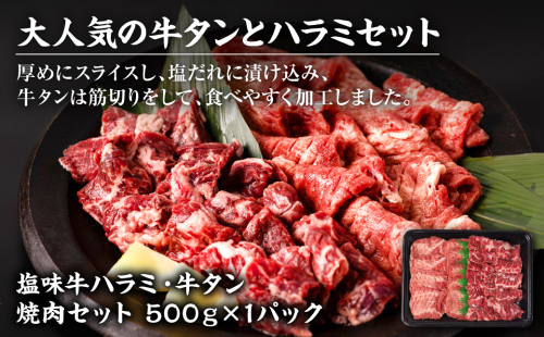 ※大人気の牛タンとハラミをセットにして厚めにスライスし、塩だれに漬け込み、筋切りをして食べやすく加工しました。