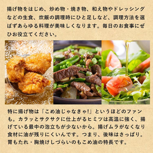大人気のこめ油の大容量セットです!揚げもの、炒めもの、ドレッシング、通常のサラダ油と同様に普段のお料理にお使いいただけます。国産原料を使用、素材の持ち味を生かすさらっとした風味の良さ。どんな料理にもおすすめ!ビタミンE、トコトリエノールなどの健康に良いとされる成分を含有。油の食物繊維といわれる植物ステロールも豊富に含有しています。