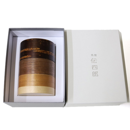 外筒と内筒で作られる「型もの」技法の特性を活かしつつ、新しい製法を用いた藤木伝四郎商店オリジナルの茶筒です。桜皮、くるみ、さくら、かえでの各外筒を4つに輪切りにしたものを組み替え、内筒にかぶせました。用いている素材は、上から桜皮の無地皮、くるみ、さくら、かえでで、一番上の外蓋に用いられている「無地皮」が品名となっています。デザイン:山田佳一朗
