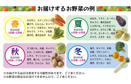 たけのこ、スナップエンドウ、絹さや、人参、泉州玉ねぎ、ピーマン、かぼちゃ、セロリ、きゅうり、トマト、小松菜、菜の花、キャベツなど