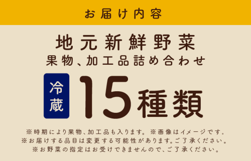 - 120サイズ箱に15種類の地元新鮮野菜や果物、加工品を詰め合わせ