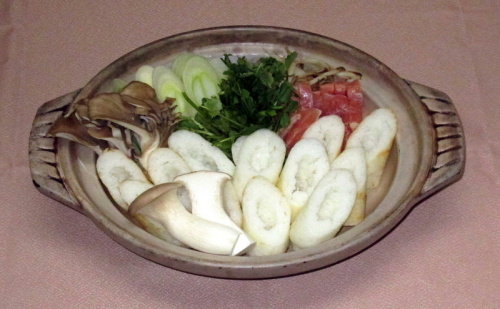 ・鶏肉、ごぼう、ネギ、糸こんにゃく、きのこ(舞茸など)、せり、自家製スープ