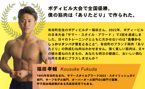ありたどりの熟成むね肉は、低温熟成庫で6時間熟成。 国内では数少ないこの熟成作業により、やわらかくジューシーで旨みのアップしたむね肉を実現しました。 鶏のむね肉を食べることで疲労を低減させることも実証されています。 ※日付指定はお断りしています(時間指定は受付可能)。 ※写真はイメージです。鶏肉および肉加工品以外の物は商品ではありません。 提供:ありた株式会社 【保存方法】要冷凍-18℃以下で保存すること 【原料原産地】鶏むね肉(佐賀県) 【食品関連事業者名称】ありた株式会社 【原材料名・添加物名】 鶏むね肉(佐賀県) 【栄養成分の量及び熱量】 ありたどり 熟成むね肉(100g当たり)/ エネルギー 145kcal たんぱく質21.3g 脂質5.9g 炭水化物0.1g 食塩相当量0.1g