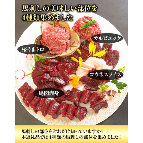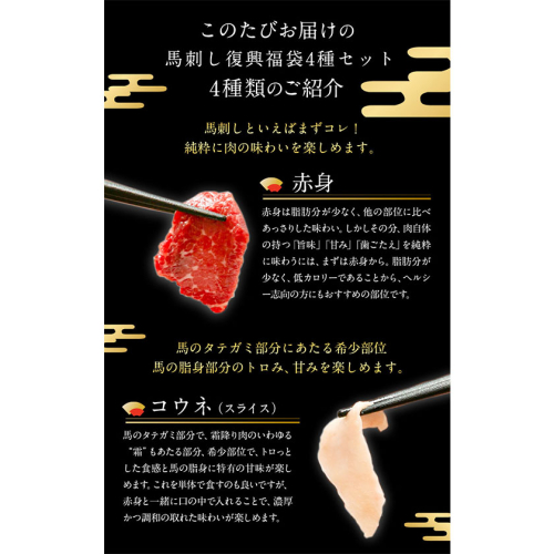 - 馬刺し復興福袋4種セット 馬肉 冷凍 《60日以内に出荷予定(土日祝除く)》 新鮮 赤身 コウネ カルビユッケ 桜うまトロ さばきたて 生食用 肉 熊本県南阿蘇村千興ファーム 馬刺し 希少部位 ばさし