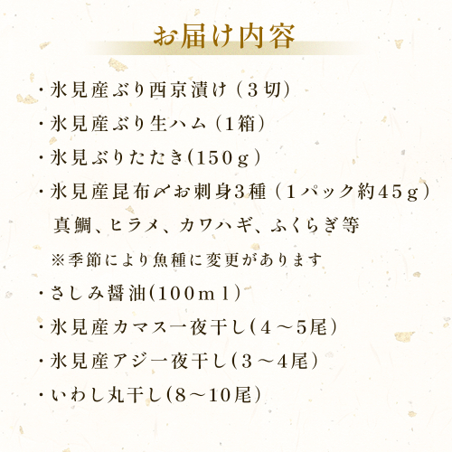 - 日本海氷見の幸10種!【氷見ぶり・昆布〆お刺身】鱈場おすすめ一夜干しセット 魚貝類 加工食品 魚介類 干物 西京漬け 鰤ハム カマス アジ 一夜干し 醤油 昆布締め 富山湾 氷見