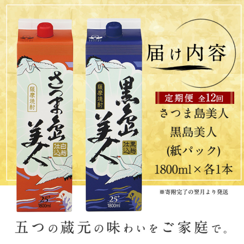 <定期便・全12回>本格焼酎「さつま島美人」「黒島美人」紙パック(1800ml×各1本)【長島町】nagashima-1156-12
