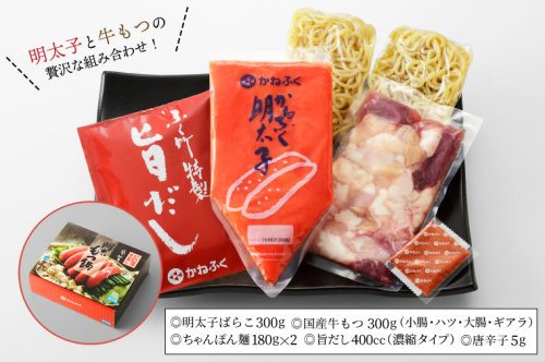 (牛もつ/国産300g、明太子ばらこ300g、濃縮だし400g、ちゃんぽん麺180g×2玉、唐辛子5g)