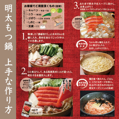 国産牛の4種類のミックスもつ、鍋専用に仕立てた明太子がたっぷり300g。