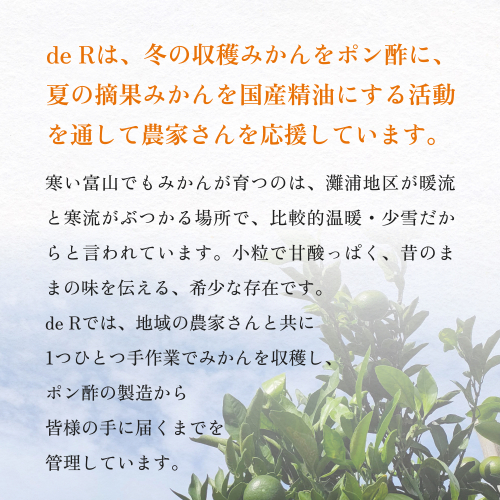 de Rは、冬の収穫みかんをポン酢に、夏の摘果みかんを国産精油にする活動を通して農家さんを応援しています。