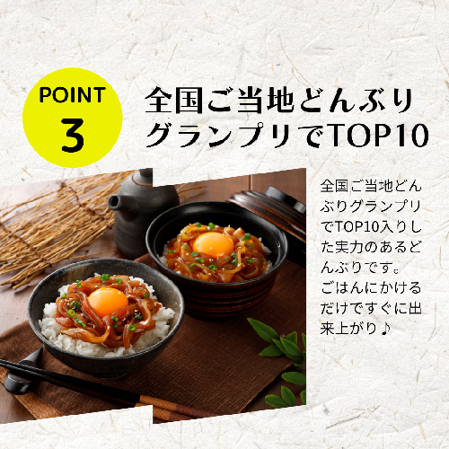 解凍してそのままご飯に乗せるだけ! 海士町の有名なソウルフード「寒シマメ肝醤油漬け丼」をお楽しみいただけます。 「全国ご当地どんぶり選手権」でも数回トップ10入りを果たした、人気の丼ぶりです! 新鮮なスルメイカだからこそ感じられる深みのある味わい。 余計な物は一切いれない、本物の美味しさをぜひご体感ください! ■こんな方におすすめ ・海士町のソウルフード、ご当地グルメを試してみたい方 ・お酒が好きな方 ・島の海鮮を少しずつ、長く楽しみたい方 ・簡単に、手間をかけず調理できるものをお求めの方 ・大容量ではなく、小分けパックをお求めの方