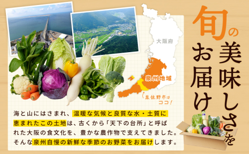 海と山にはさまれ、温暖な気候と良質な水・土質に恵まれたこの土地は、古くから「天下の台所」と呼ばれた大阪の食文化を、豊かな農作物で支えてきました。そんな泉州自慢の新鮮な季節のお野菜と、当社の農場で採れた新鮮なお野菜をおまかせ15種以上類以上まとめてお送りいたします。