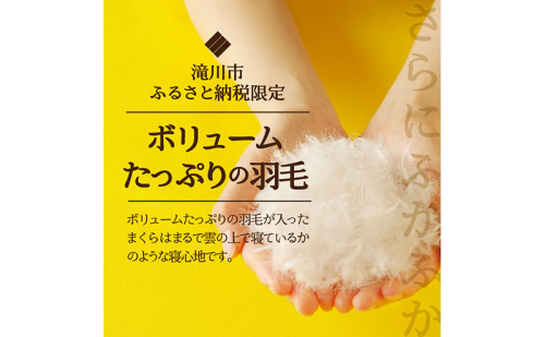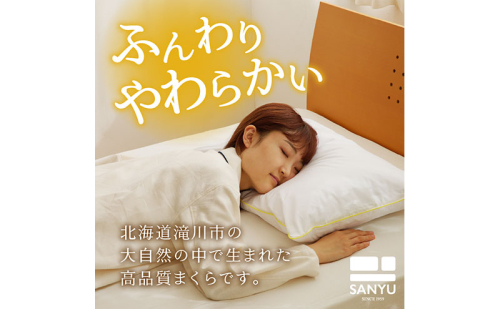 【ふるさと納税限定品】リピート率No.1商品! ~五つ星ホテル品質の寝心地をおうちでも~ 滝川市の大自然の中で生まれたまくらは最高の素材と技術で一つ一つ手作りで仕上げます。 国内ホテルシェア7割。日本一のホテル専用寝装メーカーがふるさと納税限定で送る高品質のまくらです。 【リピート率No.1】 三裕のまくらはリピート率No.1! 一度試したらその寝心地に魅了される事間違いなしです。 最高の睡眠を体験したい方はぜひ一度お試し下さい。 【寝心地の良さ】 一番のウリは寝心地の良さです。ふわっとやわらか素材であなたの首を優しく包み込みます。 ボリュームたっぷりの羽毛が入ったまくらはまるで雲の上で寝ているかのような寝心地です。  【滝川市のイメージカラーの黄色がアクセント】 日本有数の作付け面積を誇る菜の花畑をイメージした黄色をアクセントに使用しています。(ふるさと納税返礼品限定) 老若男女問わずインテリアとしても使える一品です。 【完全受注生産】~オーダーメイド~ 注文が入ってから作成し、皆さまのもとへお届け。 熟練の職人たちが一つ一つ手作りであなただけの為に仕上げます。 【ふるさと納税限定ロゴを採用】 通常ホテルに納品されているふとんには白と青を組み合わせたブランドロゴを使用しています。 今回のふるさと納税限定品では従来とは違い、黒と白を組み合わせたふるさと納税限定ブランドロゴを採用! それこそがふとんの三裕が本気の証なのです。 市内の工場において、原材料の仕入れから、生地縫製、仕立て、綴じ、梱包を一貫して行っております。