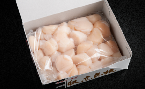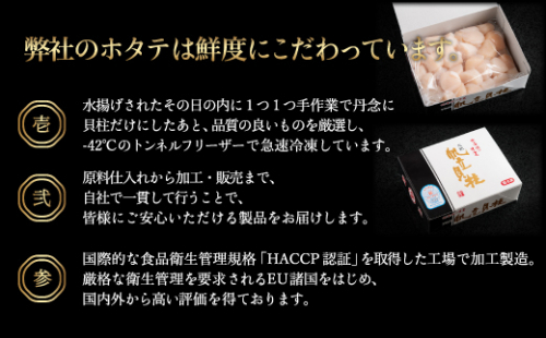 水揚げされたその日の内に ”1つ1つ手作業” で丹念に貝柱だけにしたあと、品質の良いものを厳選し、-42℃のトンネルフリーザーで急速冷凍しています。