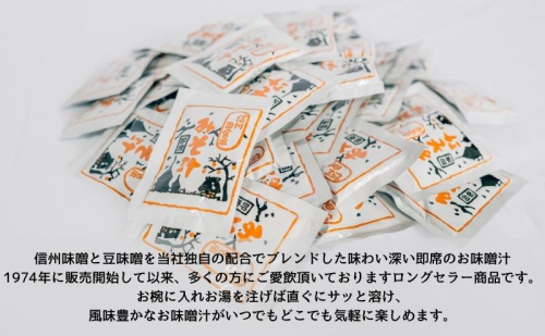 フリーズドライ製法で乾燥した信州味噌と豆味噌を当社独自の配合でブレンドした味わい深い即席のお味噌汁です。個包装の粉末タイプなので、お椀に入れお湯を注げば直ぐにサッと溶け、風味豊かなお味噌汁がいつでもどこでも気軽に楽しめます。お好みに応じてわかめやお豆腐などの具材を加えても美味しく頂けます。1974年に販売開始して以来、多くの方にご愛飲頂いておりますロングセラー商品です。
