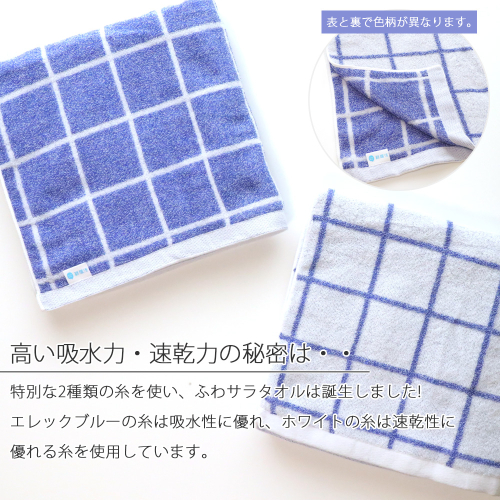 「ふわサラ」シリーズのエレックブルーの糸は吸水性に優れ、ホワイトの糸は速乾性に優れる糸を使用しています。
