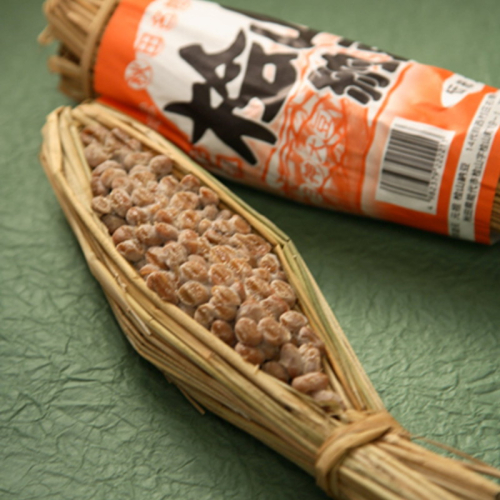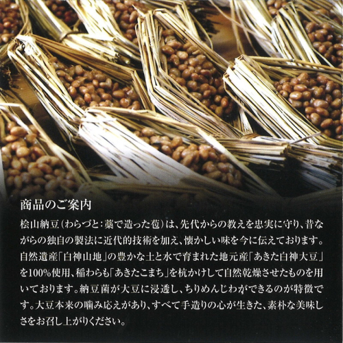 檜山納豆は江戸時代初期に作られた民謡「秋田音頭」に唄われている秋田名物のひとつです。先代からの教えを忠実に守り、15代に亘って受け継いできた納豆は、昔から変わらない手作りです。機械に頼る部分は大豆を窯で煮ることと醗酵室に入れるだけ。わらづと(わらを束ね、中へ物を包むようにしたもの)も手作業で作っており、製法を変えないこだわりを持って懐かしい味を今に伝えています。大豆は白神山地の豊かな土と水で育まれた地元産「あきた白神大豆」を100%使用し、稲わらも「あきたこまち」を杭かけして自然乾燥させたものを使っています。納豆菌が大豆に浸透し、ちりめんじわができるのが特徴です。