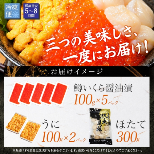 3350. 3種 海鮮丼 鱒 いくら醤油漬け 100g×5 5-6人前 ウニ チリ産 雲丹 うに 200g ホタテ 300g 帆立 いくら いくら醤油 イクラ 魚卵 海鮮 送料無料 北海道 弟子屈町