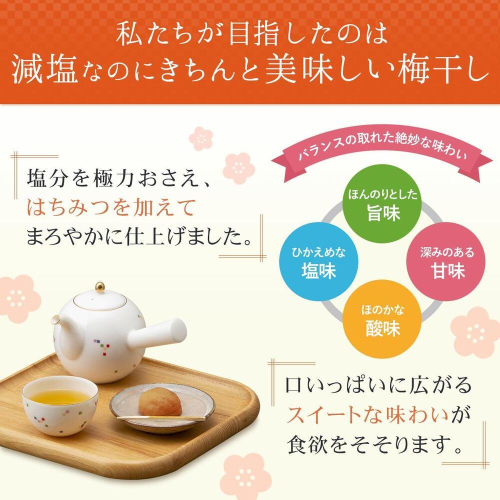 ふっくら柔らかい果肉の紀州産完熟南高梅を、塩分を極力おさえ、はちみつを加えてまろやかに仕上げました。