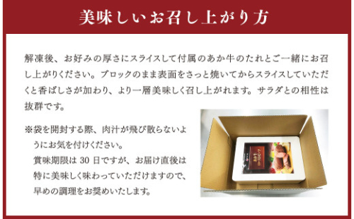 解凍後、お好みの厚さにスライスして付属のあか牛のたれとご一緒にお召し上がりください。