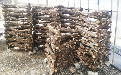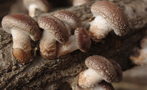 原木しいたけは、山から木を伐り出し、丸太に種菌を植えて育てます。