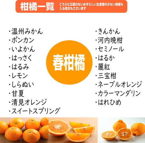 温州みかん・ポンカン・いよかん・はっさく・はるみ・レモン・しらぬい・甘夏・清見オレンジ・スイートスプリング・河内晩柑・セミノール・はるか・麗江・三宝柑・ネーブルオレンジ・カラーマンダリン・はれひめ など