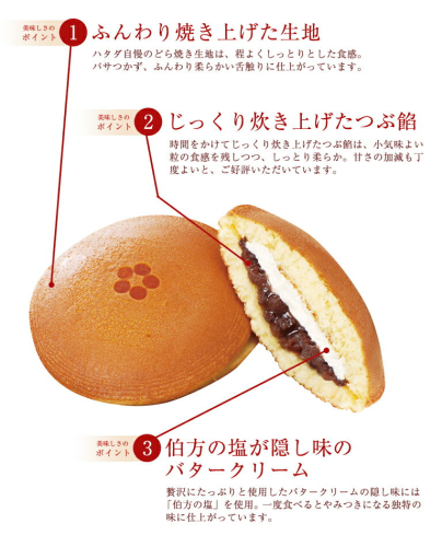ふんわりと焼き上げたどら焼き生地で、しっとり柔らかく炊き上げた粒あんと伯方の塩がかくし味の塩バタークリームを挟み込みました。