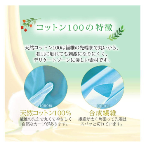 1.【繊維の先端の違い】合成繊維は繊維が太く角張って先端はスパッと切れているのに対し、天然コットンは繊維の先端まで丸いから、お肌に触れても刺激になりにくく、デリケートゾーンに優しい素材です。又アトピー疾患がある方にも安心です。