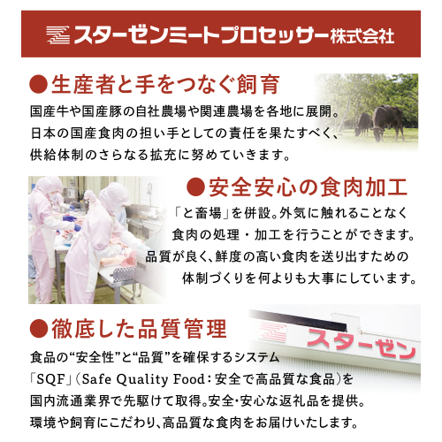 世界基準の徹底した衛生管理体制を行っている「スターゼンミートプロセッサー株式会社」が、畜産王国鹿児島県南さつま市の工場よりお届けします。