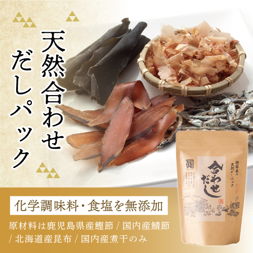 鹿児島産のかつお節を主とし、国内産の煮干、さば節、昆布などの天然素材のみをバランスよくブレンドした、だしパックです。すべて無添加。