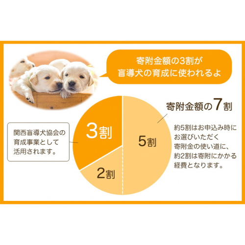 ※当該寄附は、返礼品相当額(寄附額の3割)を関西盲導犬協会への支援とするものです。寄附者様への返礼品はございませんのでご了承ください。