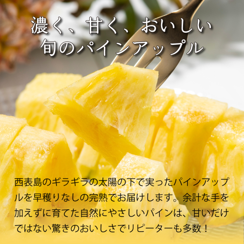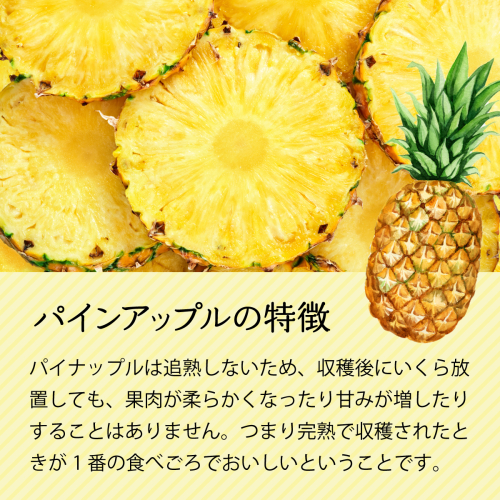 西表島のギラギラの太陽の下で実ったパインアップルを早穫りナシの完熟でお届けします。余計な手を加えずに育てた自然にやさしいパインは、甘いだけではない驚きのおいしさでリピーター続出!!(パインの種類:発送時に最も美味しい旬のパインをお送りします。)