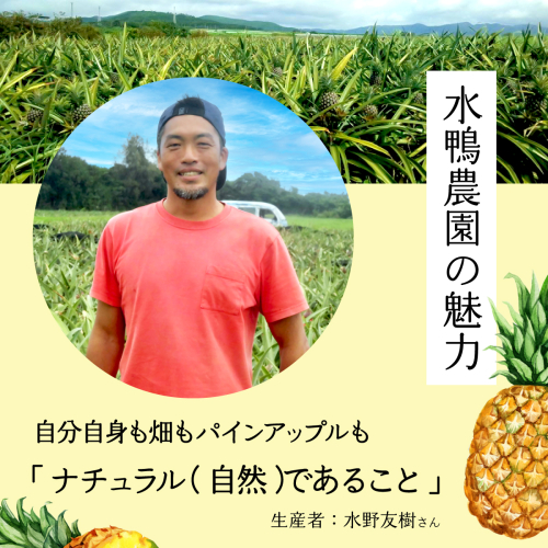 西表島のギラギラの太陽の下で実ったパインアップルを早穫りナシの完熟でお届けします。余計な手を加えずに育てた自然にやさしいパインは、甘いだけではない驚きのおいしさでリピーター続出!!(パインの種類:発送時に最も美味しい旬のパインをお送りします。) 水鴨農園のパインアップルは、化学肥料・化学農薬を抑えた環境にやさしい栽培計画で沖縄県知事よりエコファーマーに認定されました。(認定番号第955号) ※画像はイメージです。 ※出荷時期になりましたら、別途メールにてお届けについてのご案内をさせていただきます。 ※発送時期は、例年の発送時期になっております。天候や収穫状況によりお届けが遅れたり、早まることがあります。また、手配ができない場合は別途ご連絡させていただく場合がございます。 ※お客様の都合により商品を受け取れなかった場合、または受け取りまでに期間がかかった場合は、生鮮品につき返品・再配送は致しかねますので予めご了承ください。 ※大きさにより数が異なります。 ※収穫時期が限られてる為、日時指定は致しかねますので予めご了承ください。 ※生鮮品につき、到着後すぐにお召し上がりください。 ※賞味期間(目安):お届けから常温で3日(冷蔵で5日)