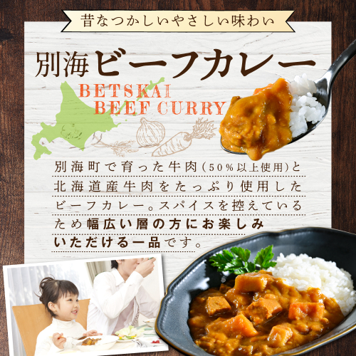 別海町で育った牛肉(50%以上使用)と北海道産牛肉をたっぷり使用したビーフカレー。昔なつかしいやさしい味わいに仕上げています。