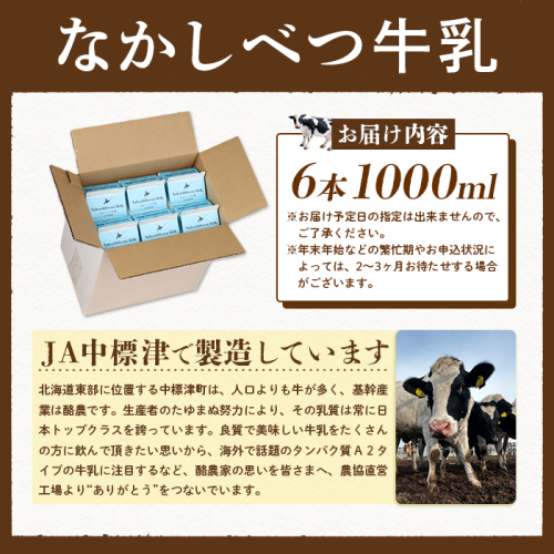 中標津町 中標津 なかしべつ牛乳 1L×6本 牛乳 北海道 ミルク 乳製品 乳飲料 健康 朝食 高栄養 国産 お取り寄せ 8000円 8,000円 ふるさと納税