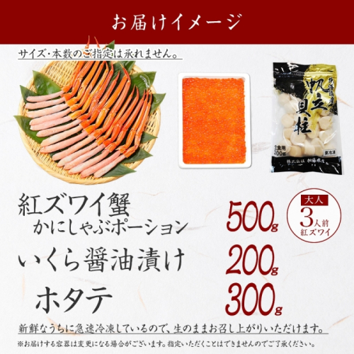 3379. 紅ズワイ蟹ポーション 500g前後 生食可 いくら醤油漬け 200g ホタテ 帆立 300gカニ かに 蟹 海鮮 海鮮丼 鍋 しゃぶしゃぶ 紅 ズワイガニ いくら イクラ 魚卵 送料無料 北海道 弟子屈町